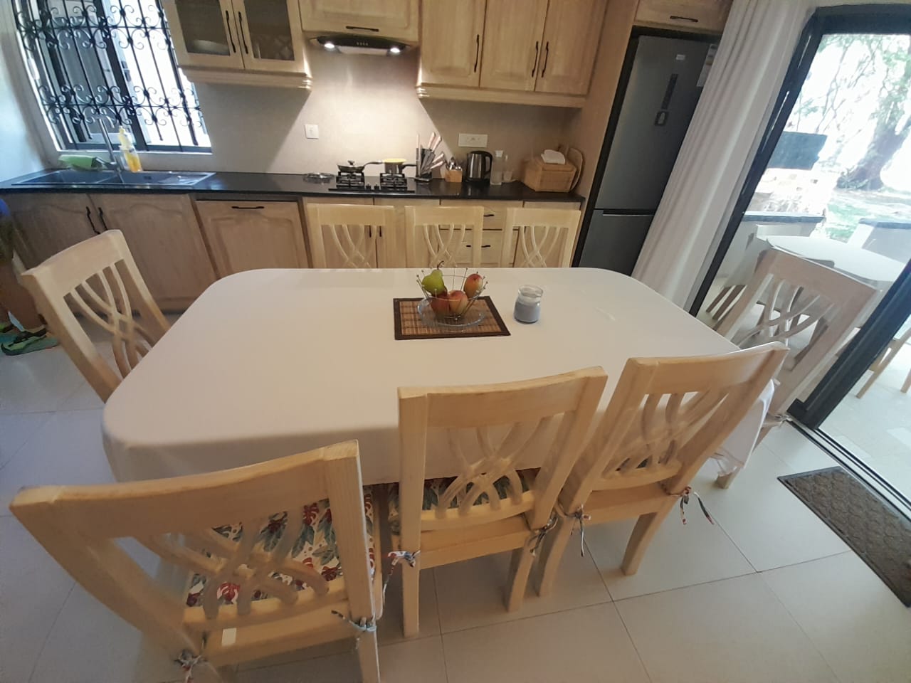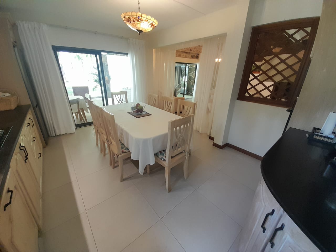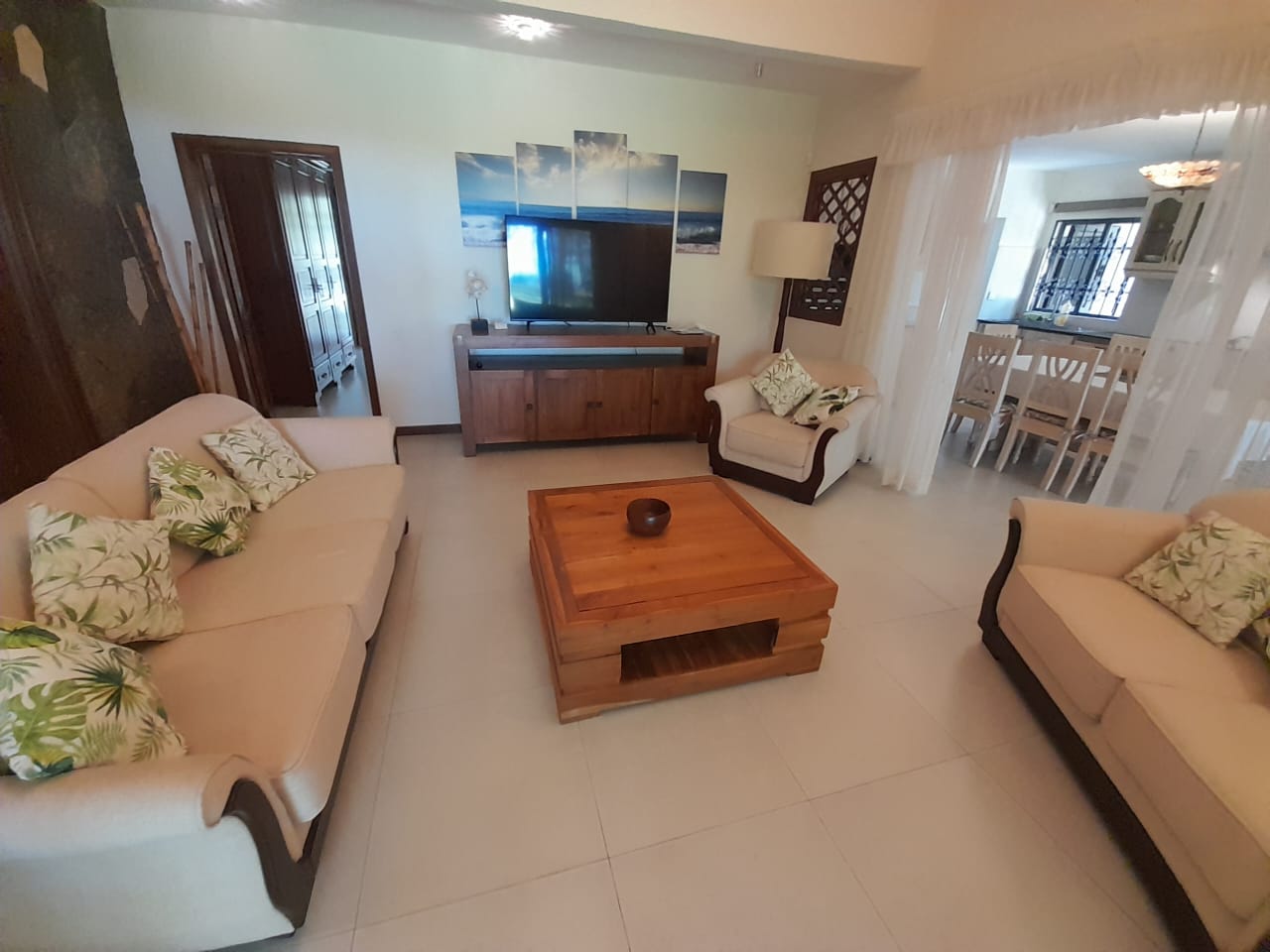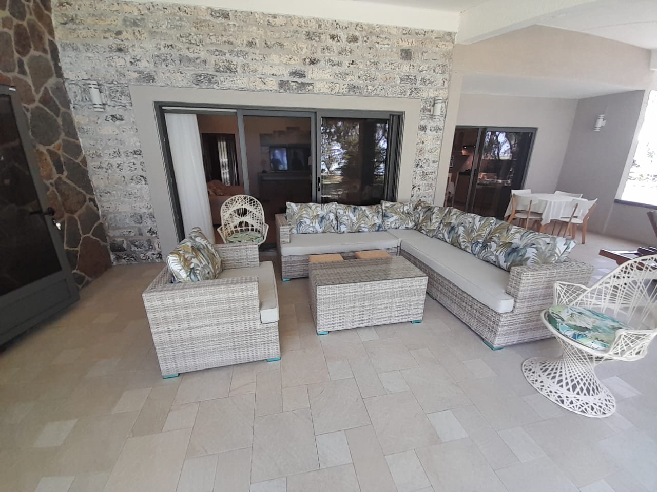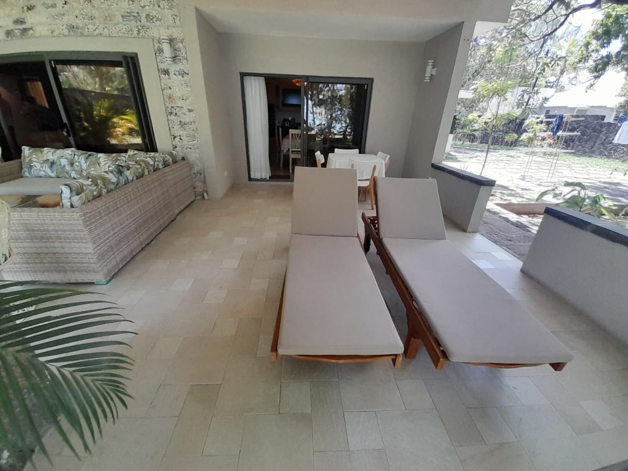 Varangue with sofa and dining table directly facing the beach
