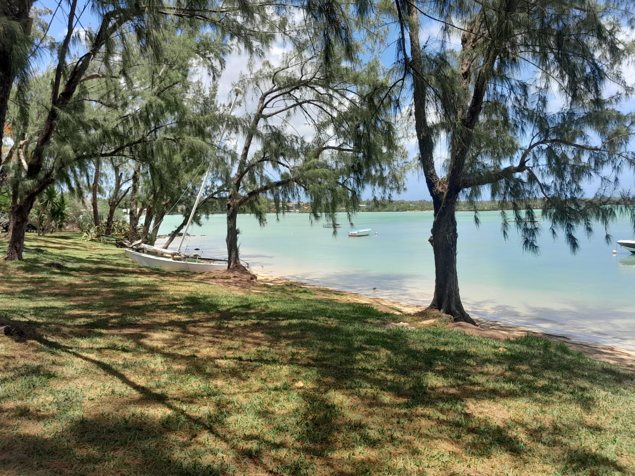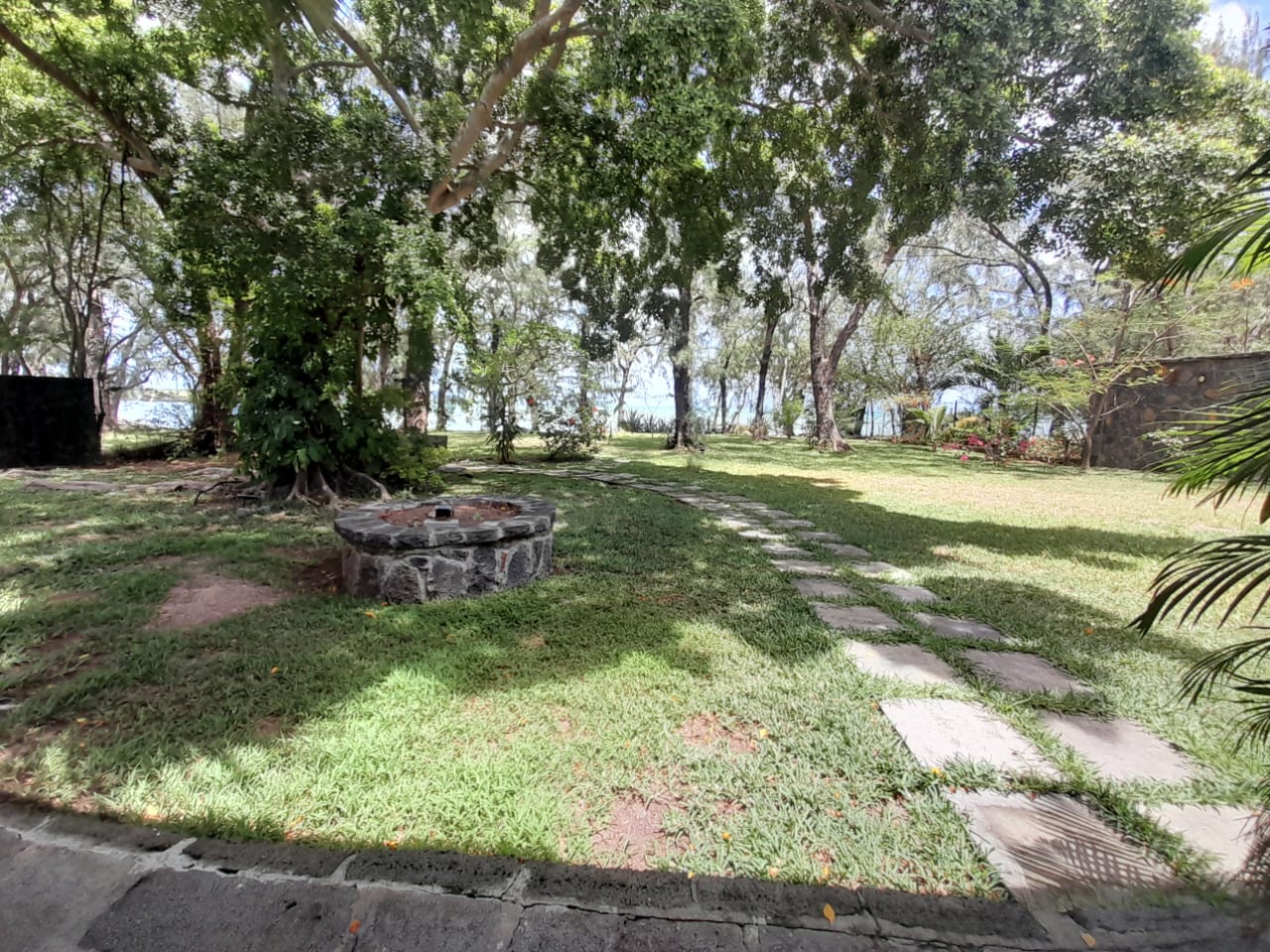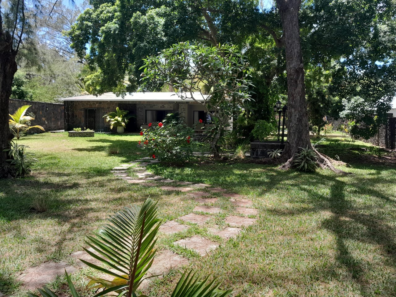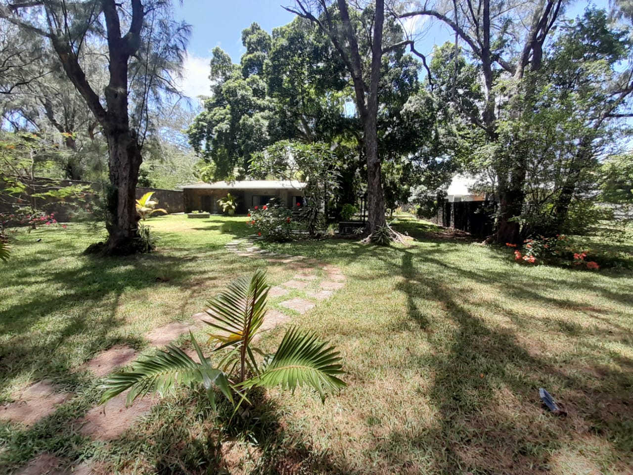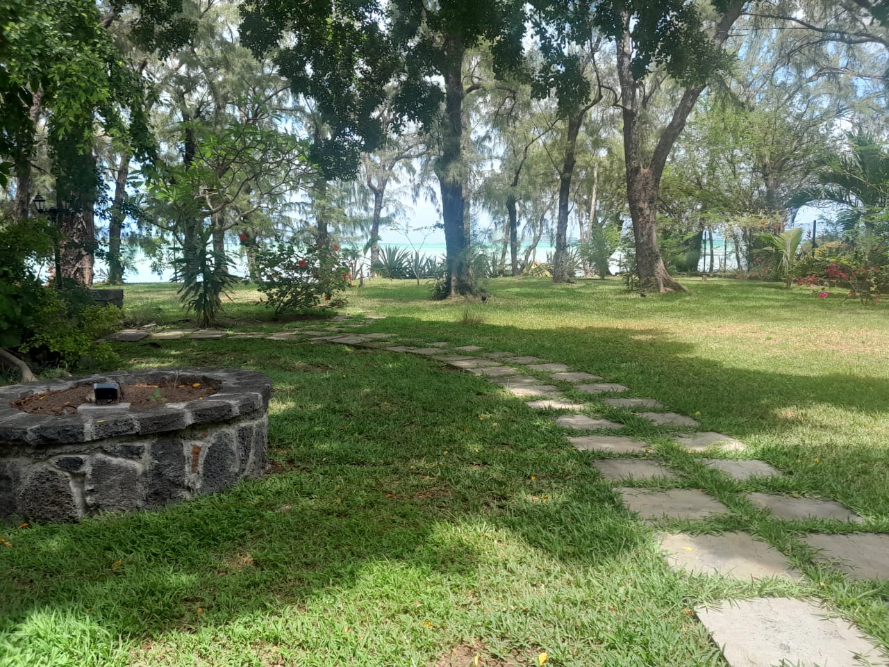 Mature trees including filaos and coconut trees