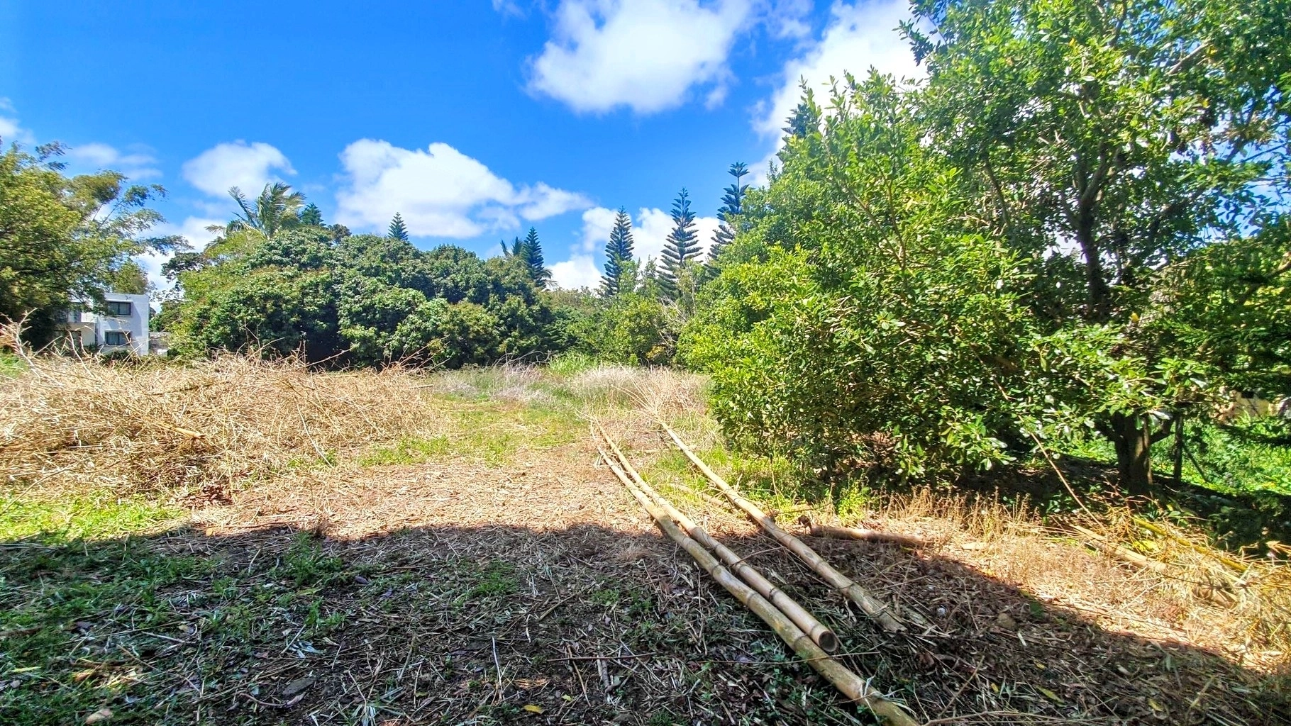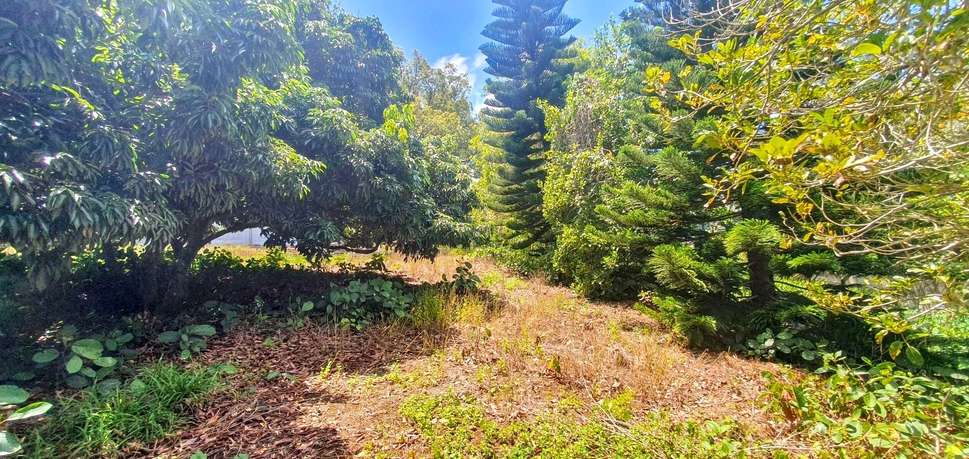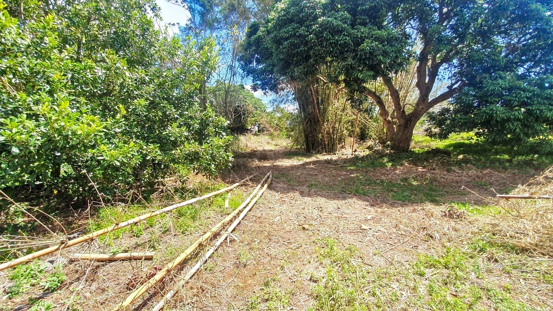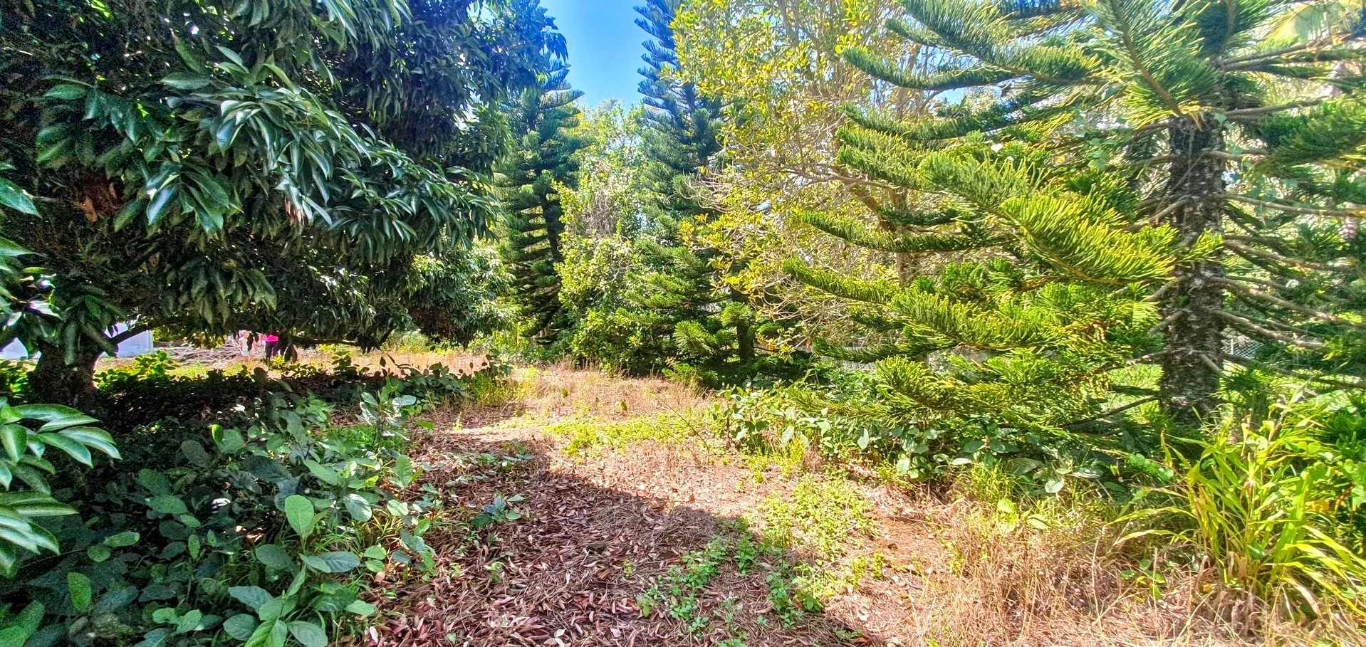 Partially vacant land with vegetation, featuring trees such as litchis, firs, and other species.