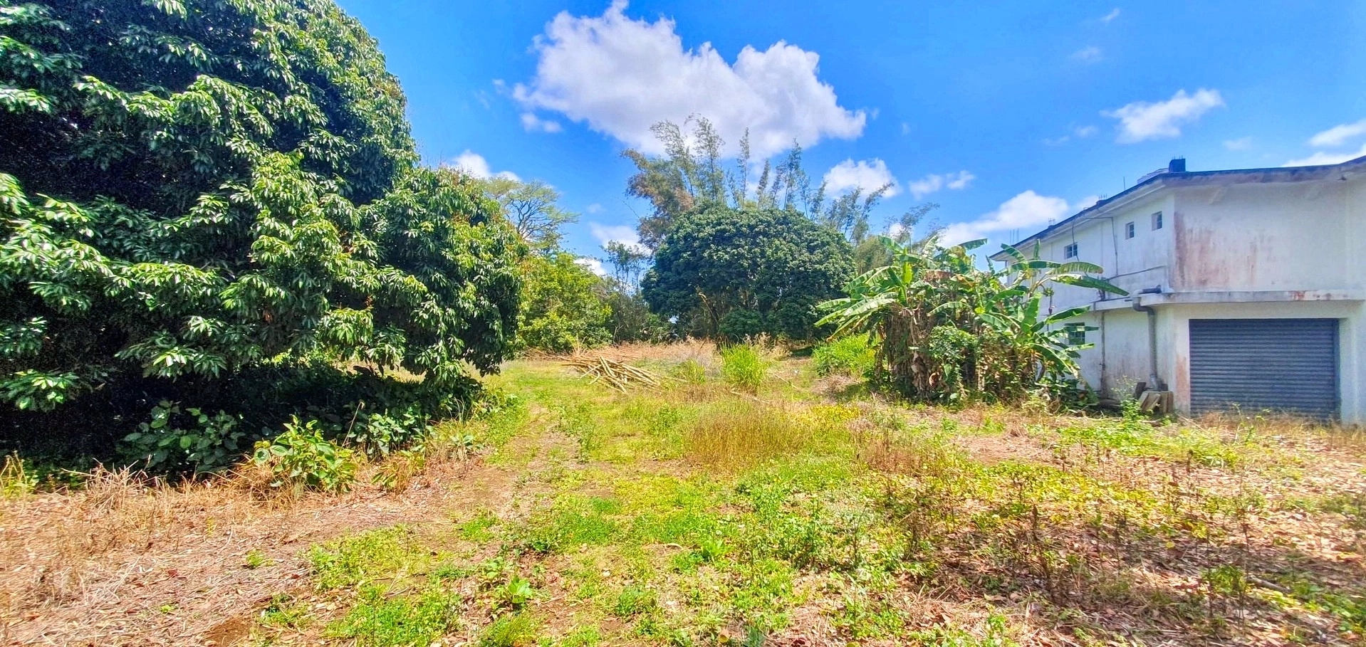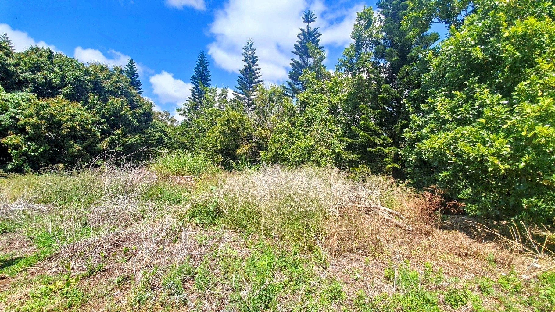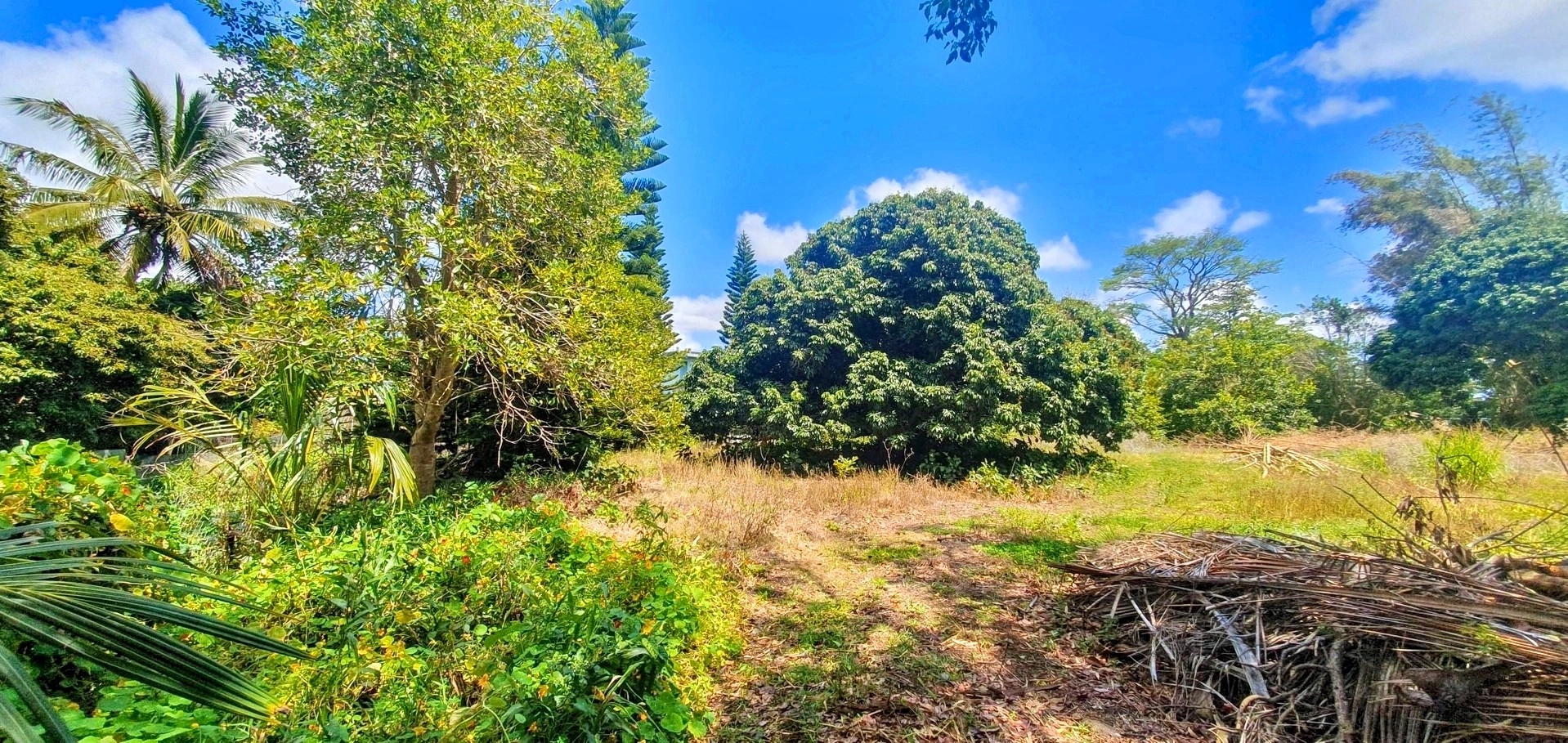 Partially vacant land with vegetation, featuring trees such as litchis, firs, and other species.