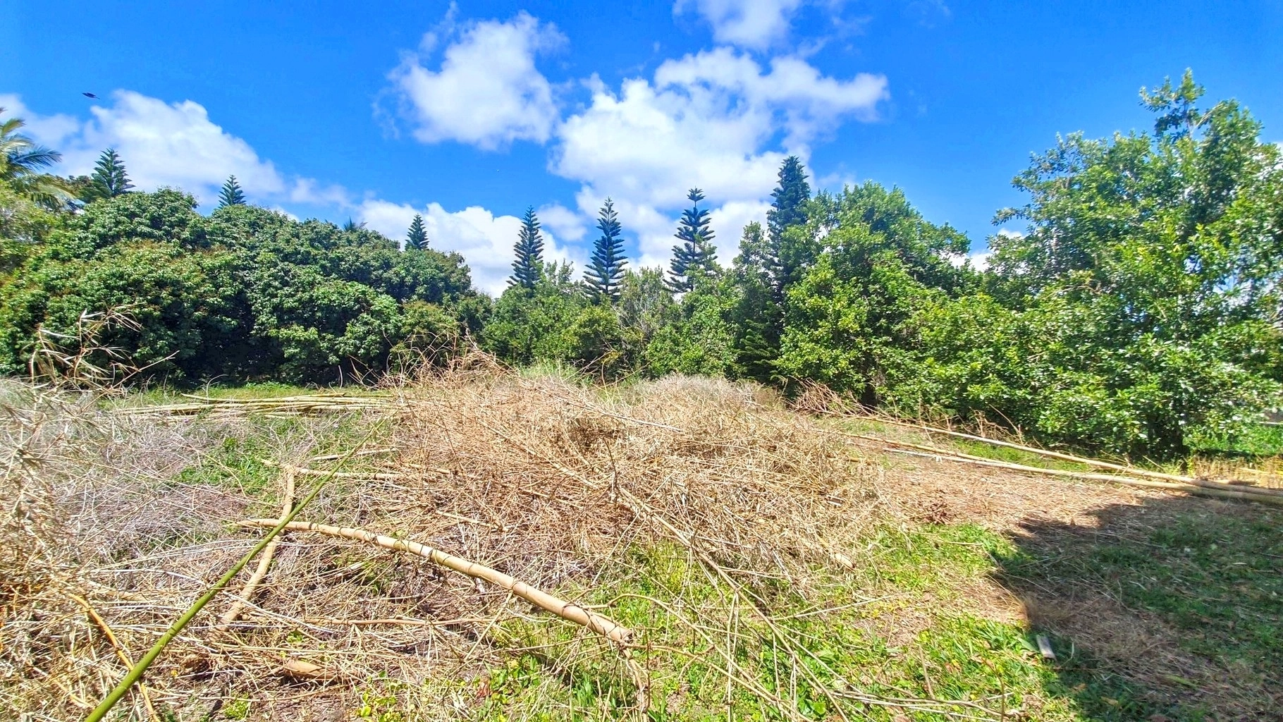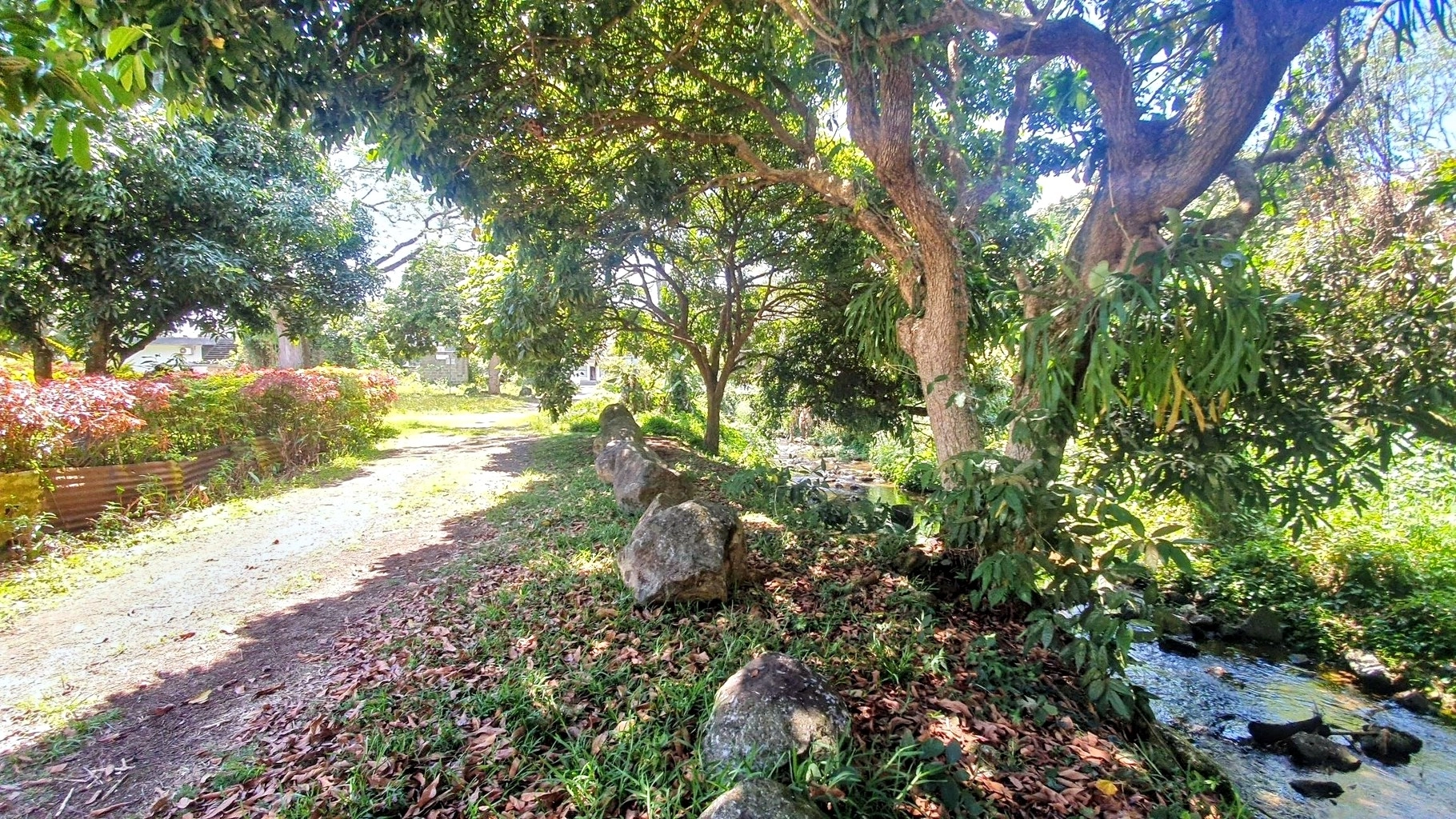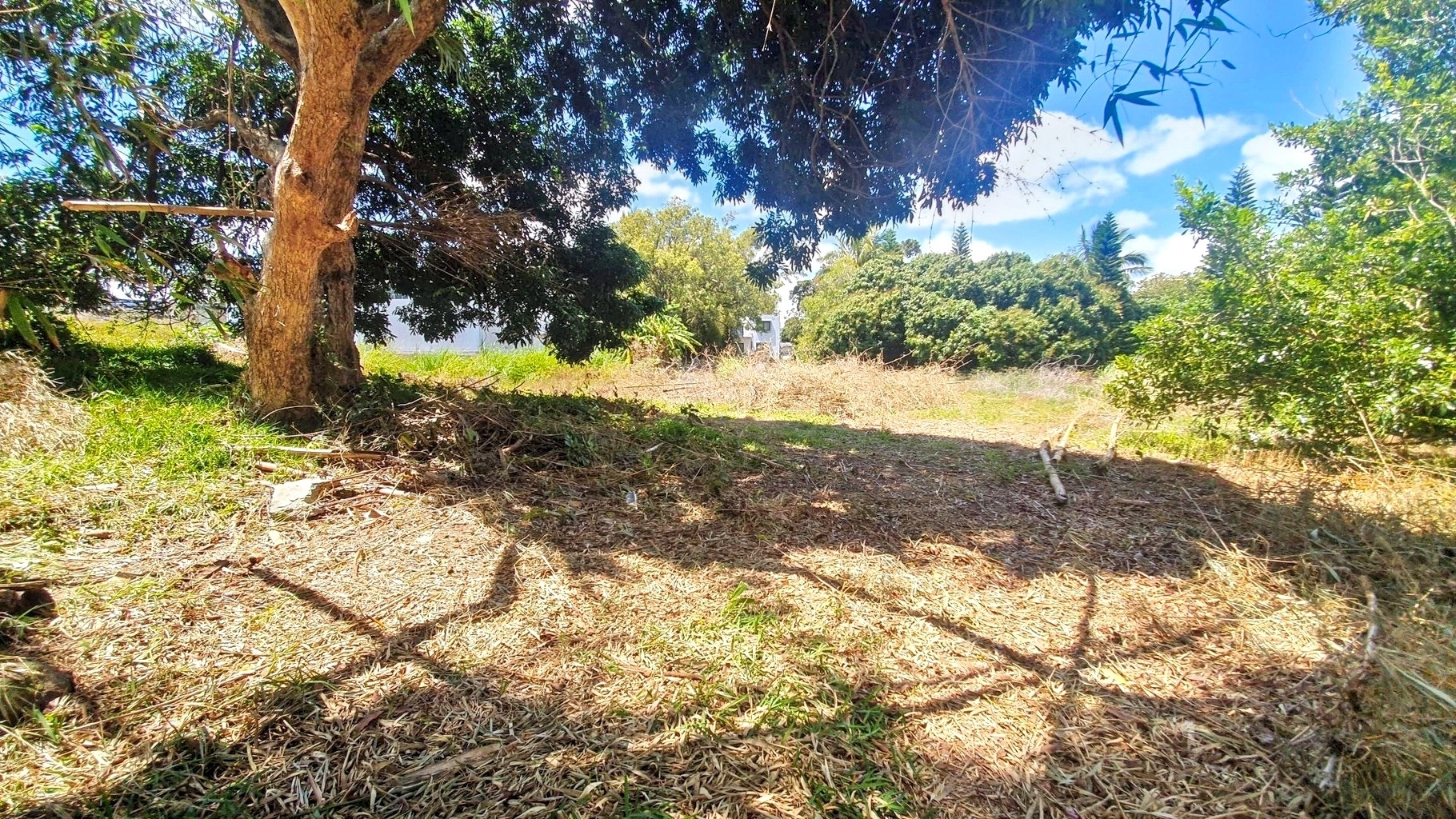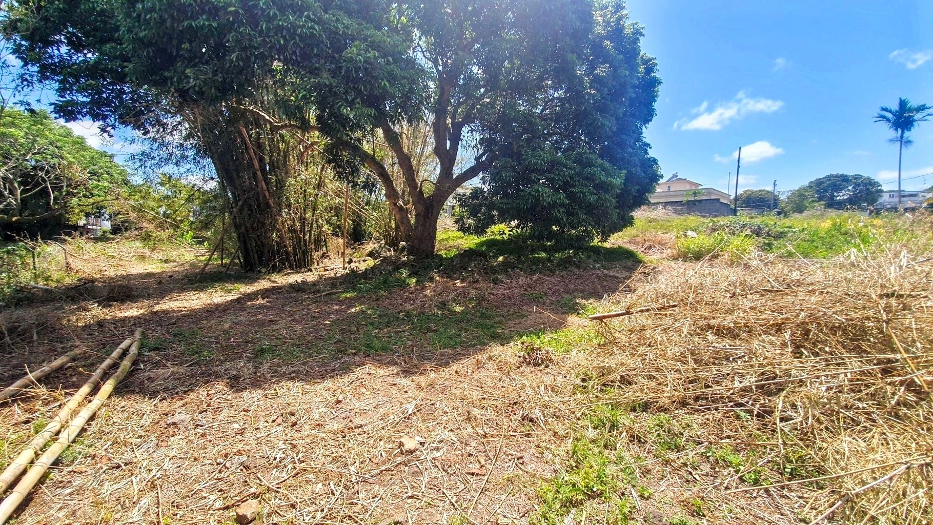 Partially vacant land with vegetation, featuring trees such as litchis, firs, and other species.