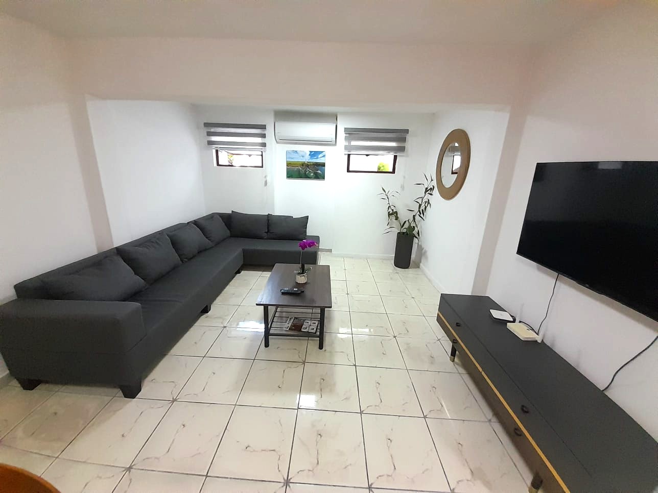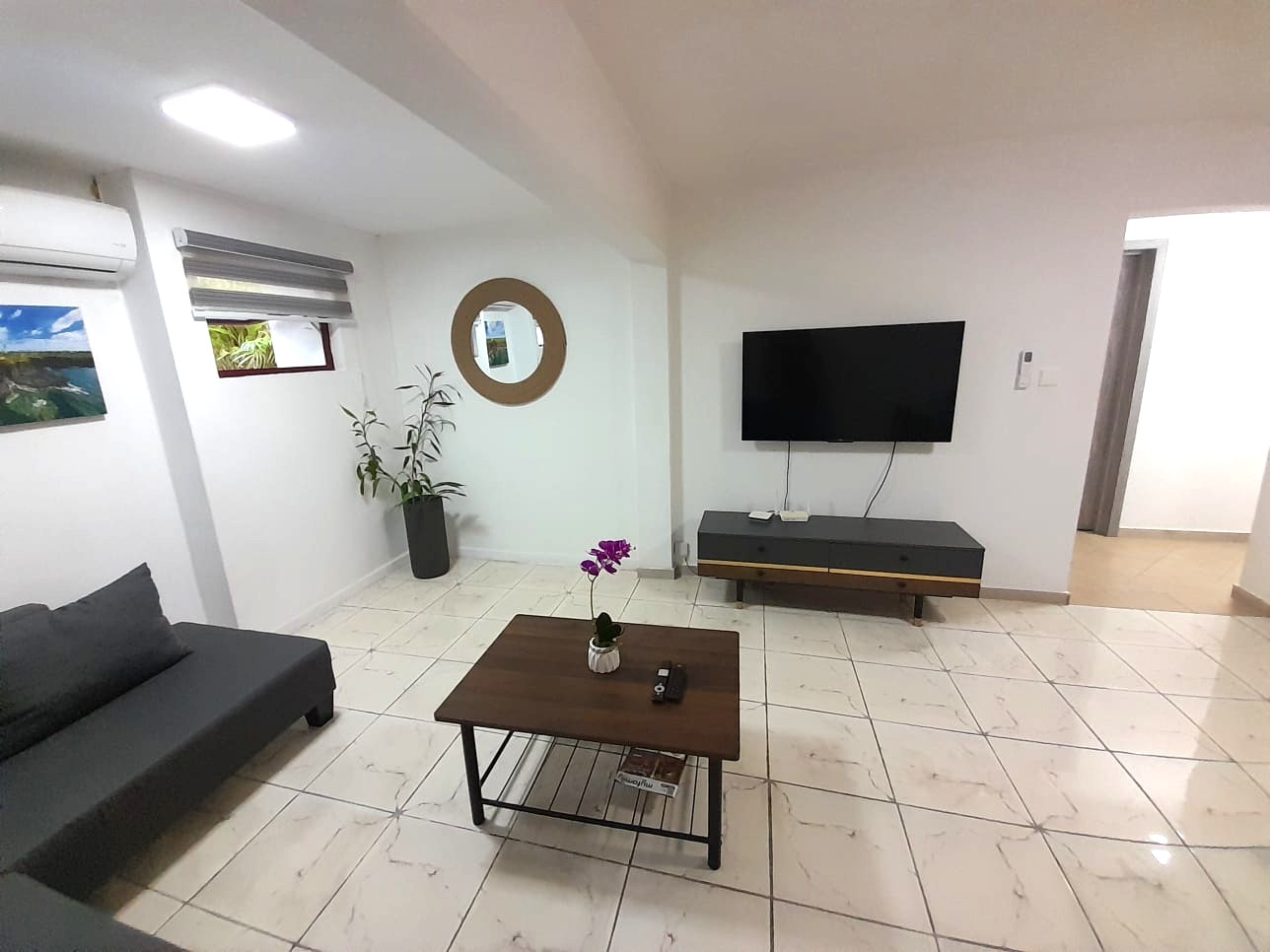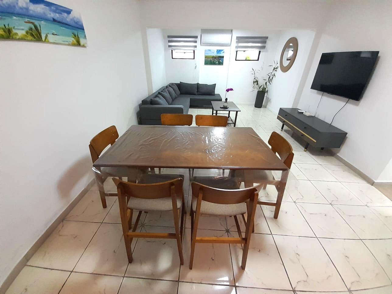 Air-conditioned living room with dining table