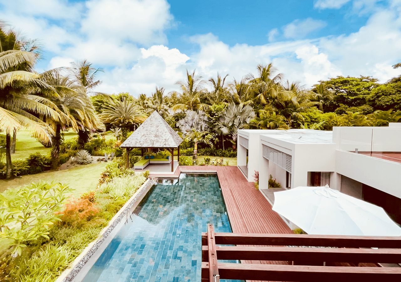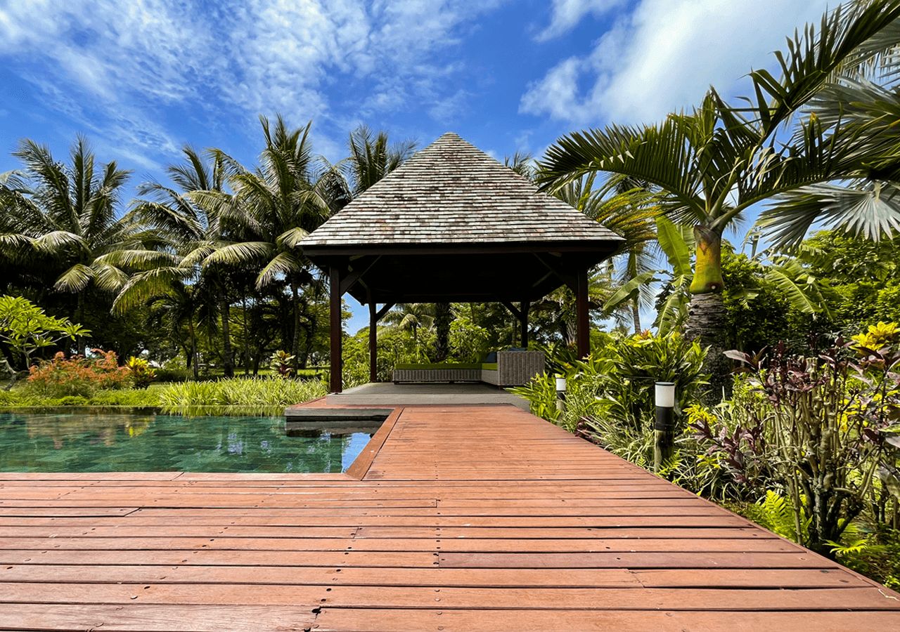 A large decked private swimming pool is nestled in a beautifully landscaped exotic garden, creating a serene outdoor retreat, ideal for relaxation and entertaining.